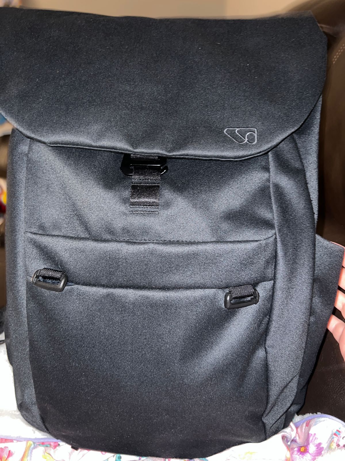 4 external pockets: zippered front pocket with key hook, zippered compartment at base of pack, side slip pocket, and expandable bottle pocket