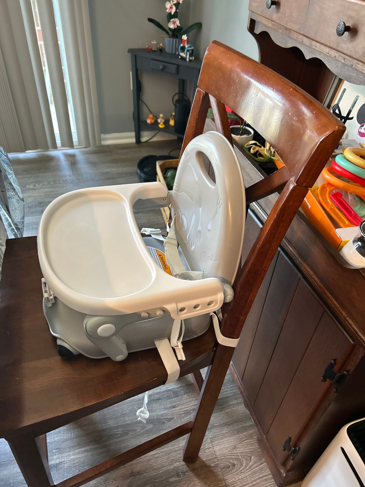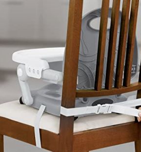 The convenient carry strap and compact fold make this seat easy to take along to restaurants, on vacation, or to visit family. The Pocket Snack Booster Seat features easy-to-clean surfaces, three tray positions, three height adjustments, and a three-point harness. The Pocket Snack is designed to be used only on dining chairs. The two straps and rubberized feet secure Pocket Snack to the dining chair. For children up to 50 lbs.