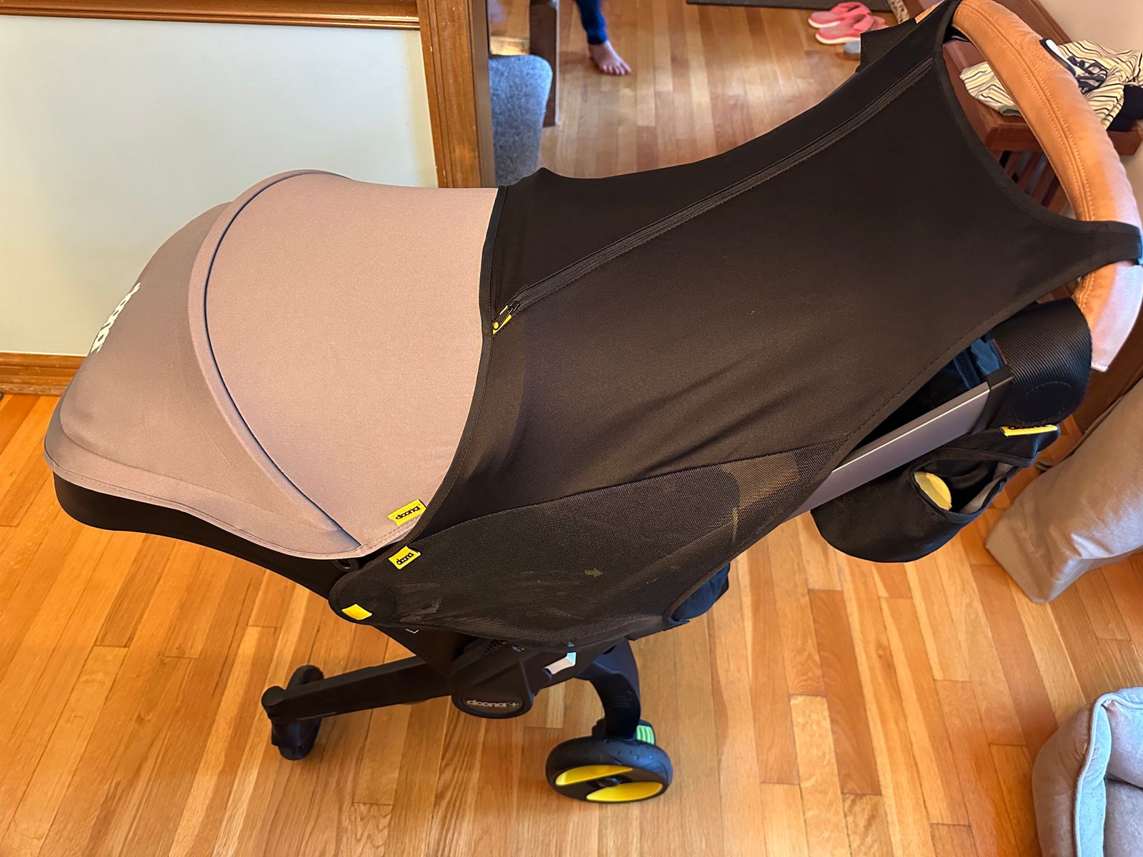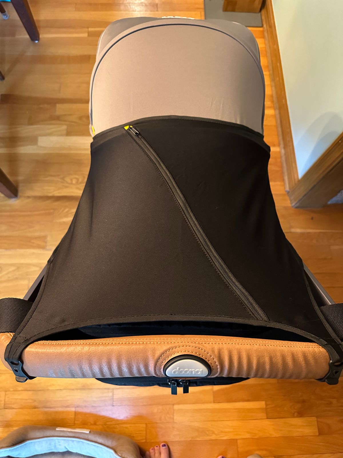 My baby was born in May & I’m so happy I have this extra shade this summer. It took a minute to figure out how to put it on the first time, but once you know how, it’s simple! There are hooks to hold it to the back of the seat, hooks for the handlebar, and tiny pegs that snap into the bottom feet part of the car seat.