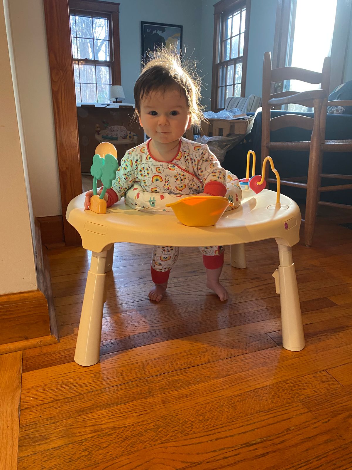 I’m happy with my purchase of this activity center. It’s great that you can take the different toys in and out easily and that the legs can get longer as your baby grows taller. Our guy is 5 months today but very tall for his age. The toys seem suitable for his stage, he loves the bobble head, the high contrast circle spinner and the wires and chips. We took out the noisy buttons for now… seems like they’re not challenging his brain in the way that we’d want in this stage. Only negative is that there could be a little more padding on the edge of the chair that ends up going against their ribs, it seems a bit hard.