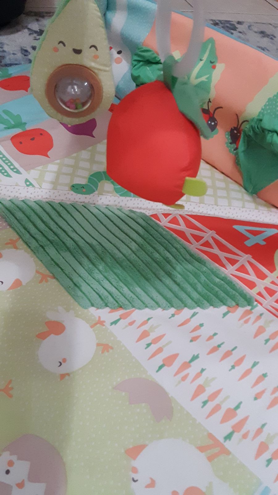 • Age 0+ • 17+ developmental activities • Cushioned playmat with pillow border • 5 hanging toys include: Llama with chime, Giraffe with crinkle and letter G teether toy, Monkey with moveable arms, • grab ring & baby mirror, Peekaboo Beehive, Dancing Sloth plays ABC song • Supportive rainbow tummy time pillow • 3 ways to play: tummy time, overhead play, seated play • 14 toy loops on mat to attach toys • Non-replaceable coin batteries included • Size: 34W x 34D x 19H