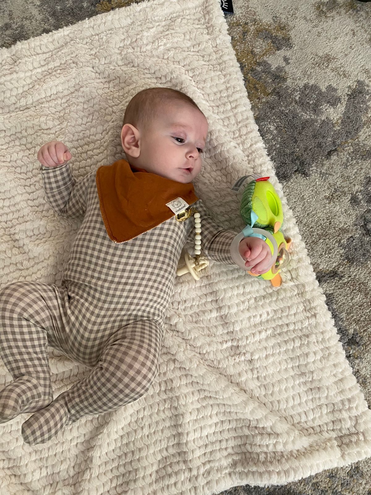 Get ready to guac and roll with our adorable avocado stroller toy. Featuring two halves that stick together, it’s easy for little hands to open and close. Inside, they’ll find (surprise!) a peek-a-boo rattle “pit” at the center. The plush, textured exterior and cute felt details make this a fresh and fun way to entertain baby wherever you go. Like all our stroller toys and portable baby toys, it has a built-in loop and ring so you can easily attach it to the bar of your stroller, infant carrier or other gear.