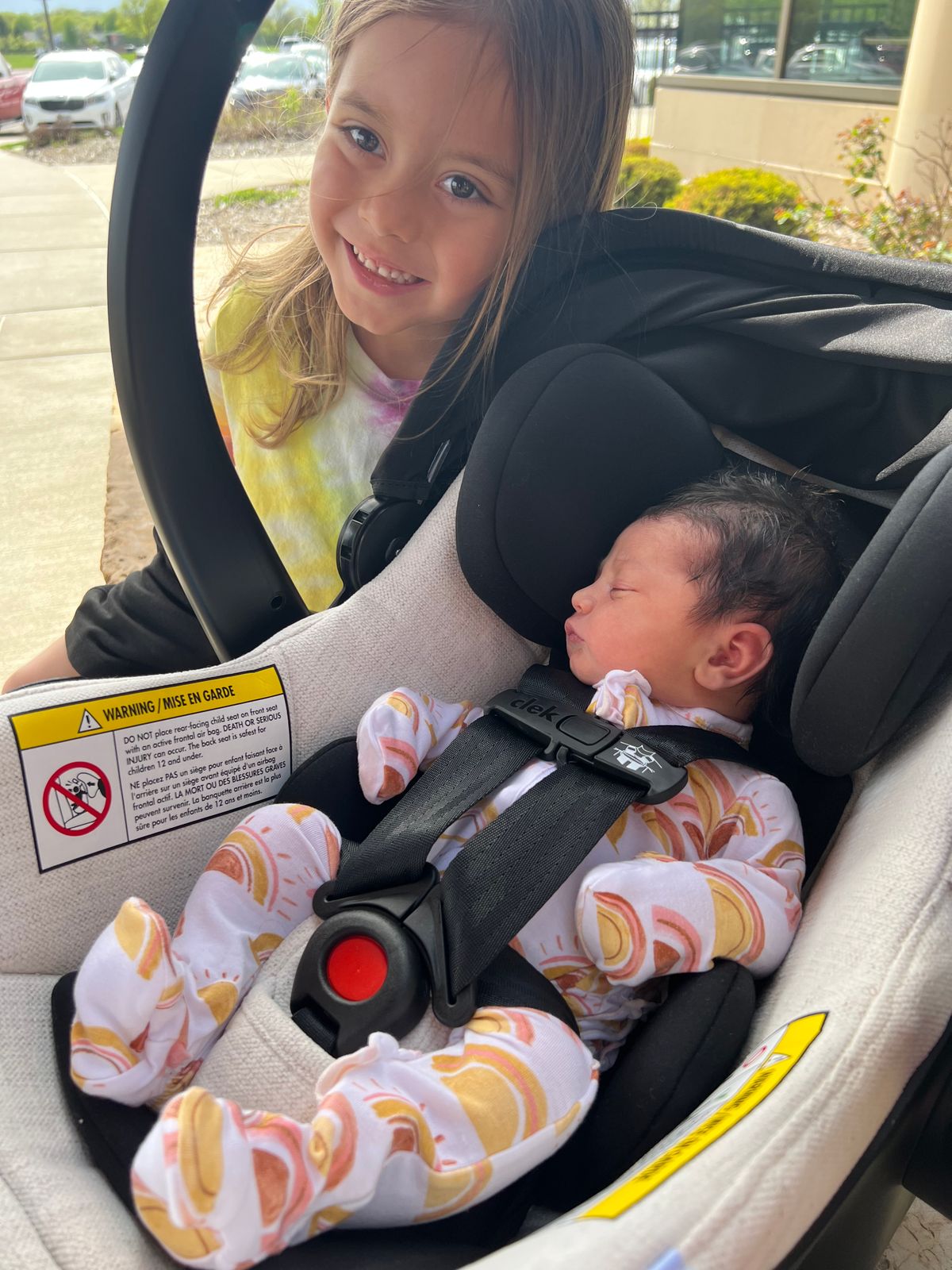 Liing infant seat with warning labels attached