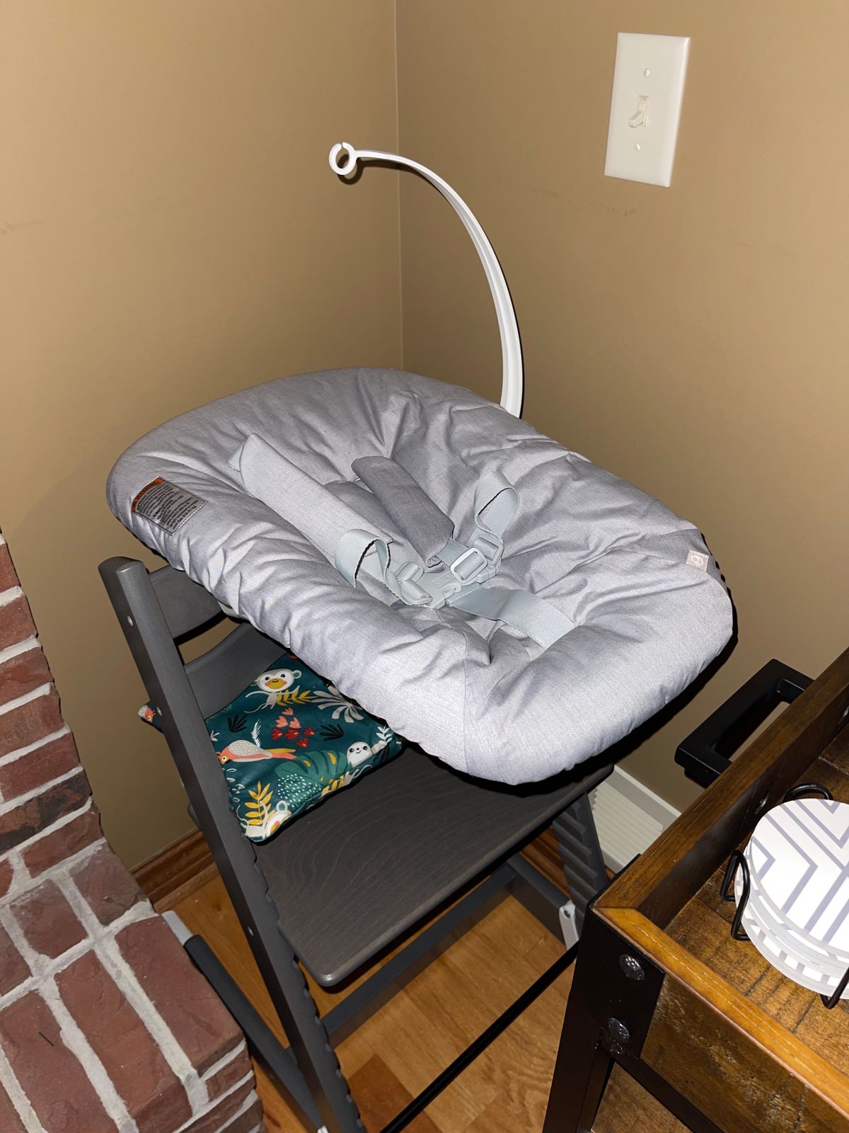 Safe and simple to use, the new Newborn Set can easily be attached and removed from the Tripp Trapp® chair. Red-green indicators reassure you that it is mounted correctly while a 5-point safety harness with protective shoulder pads keep baby extra secure. The toy hanger lets your little one keep their favorite toy close at hand to keep them entertained while helping to stimulate their evolving motor skills. Suitable from newborn up to 20 lbs.
